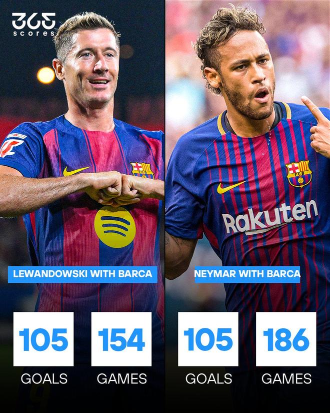 本场比赛过后,莱万巴萨生涯的进球数也达到了105粒,这也追平了内马尔的巴萨生涯进球数。
