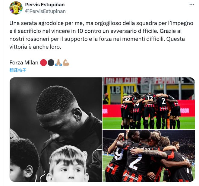 赛后埃斯图皮尼安更新了社媒:“这是一个苦涩又甜蜜的夜晚,但我为球队在少一人作战的情况下,击败强大对手所付出的努力和牺牲感到自豪。感谢我们的红黑球迷在困难时刻给予的支持与力量。这场胜利也属于他们。”